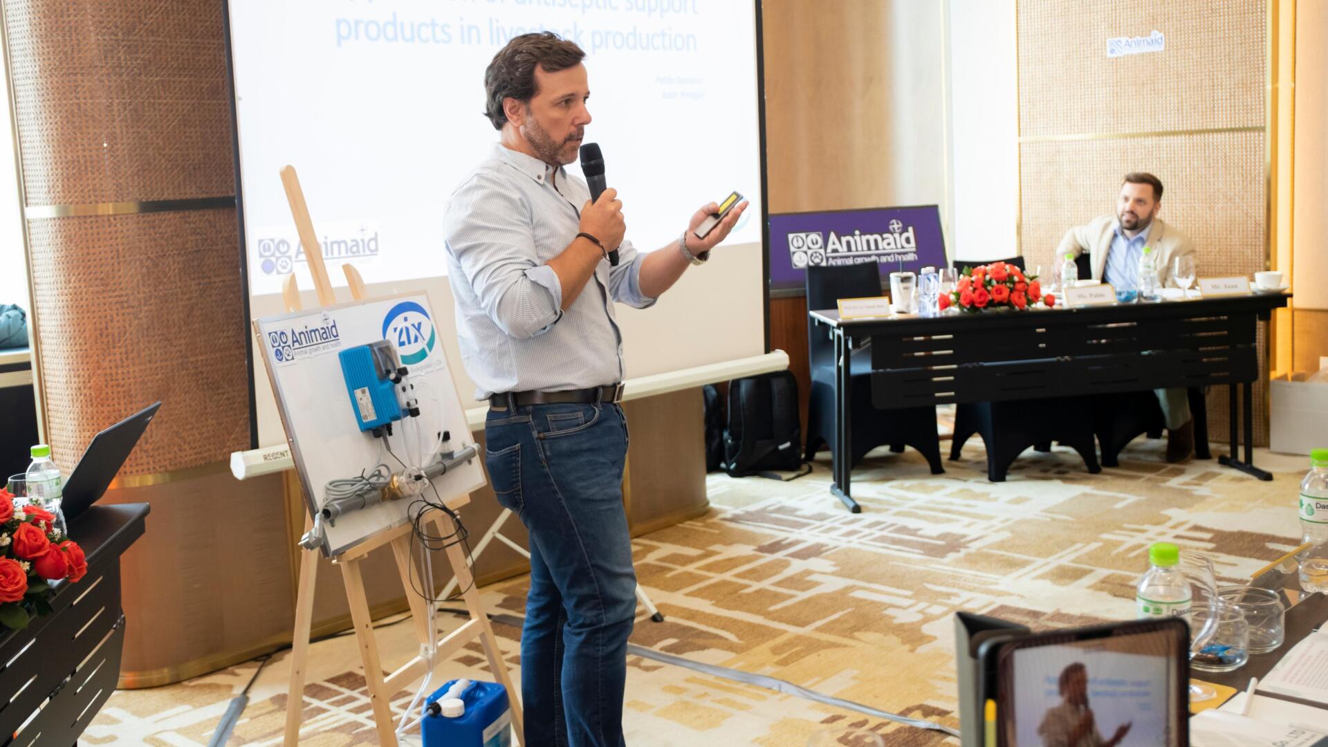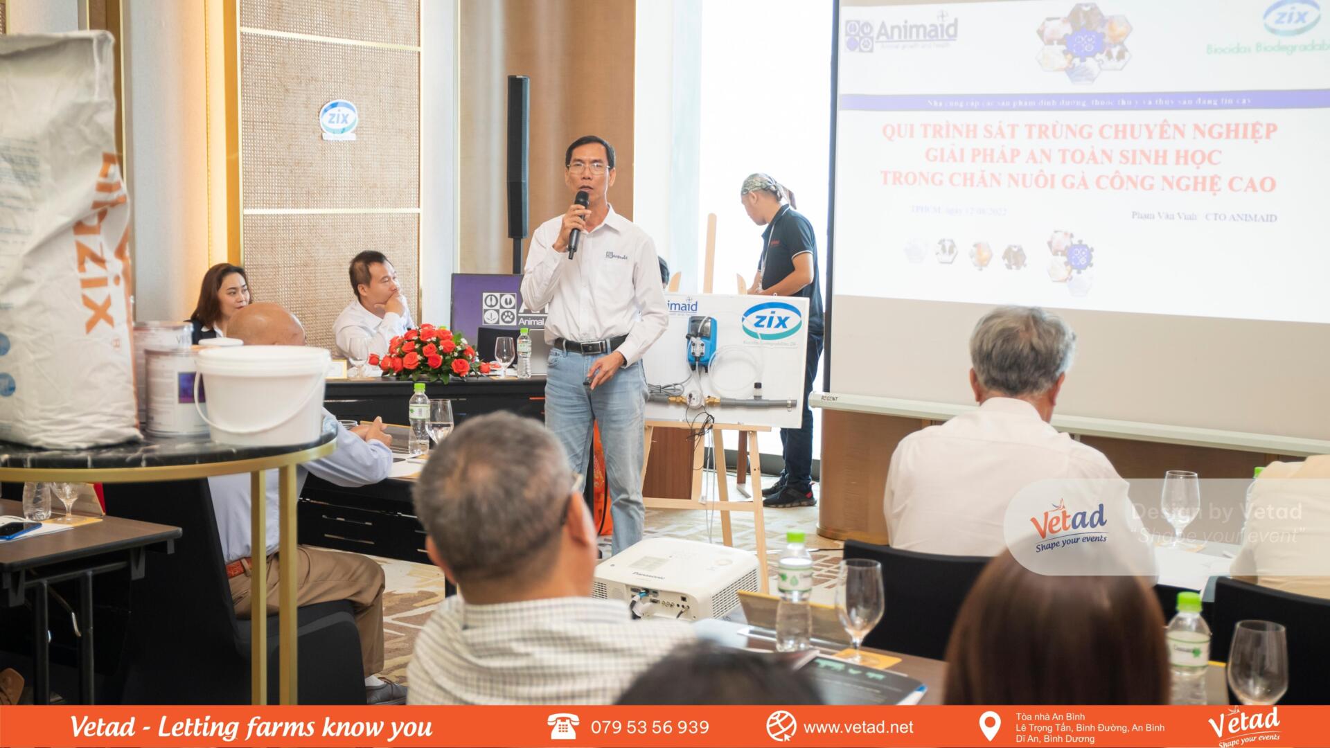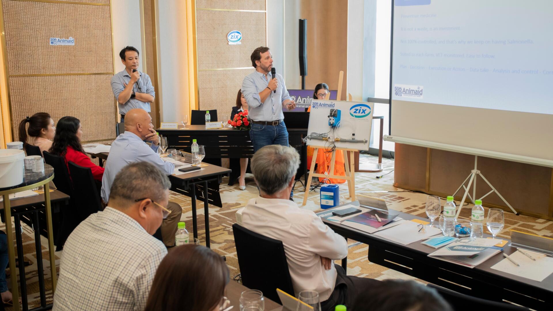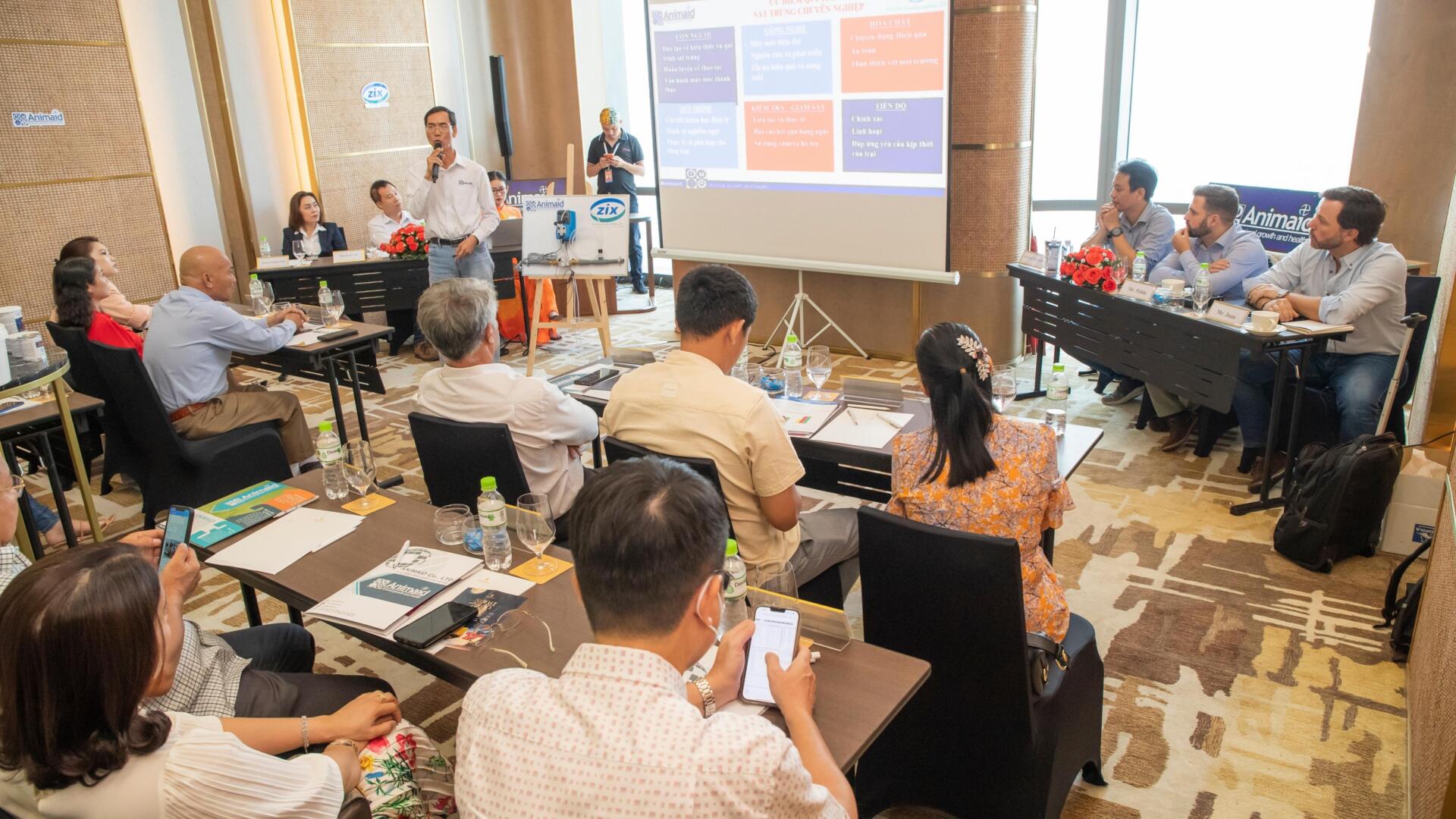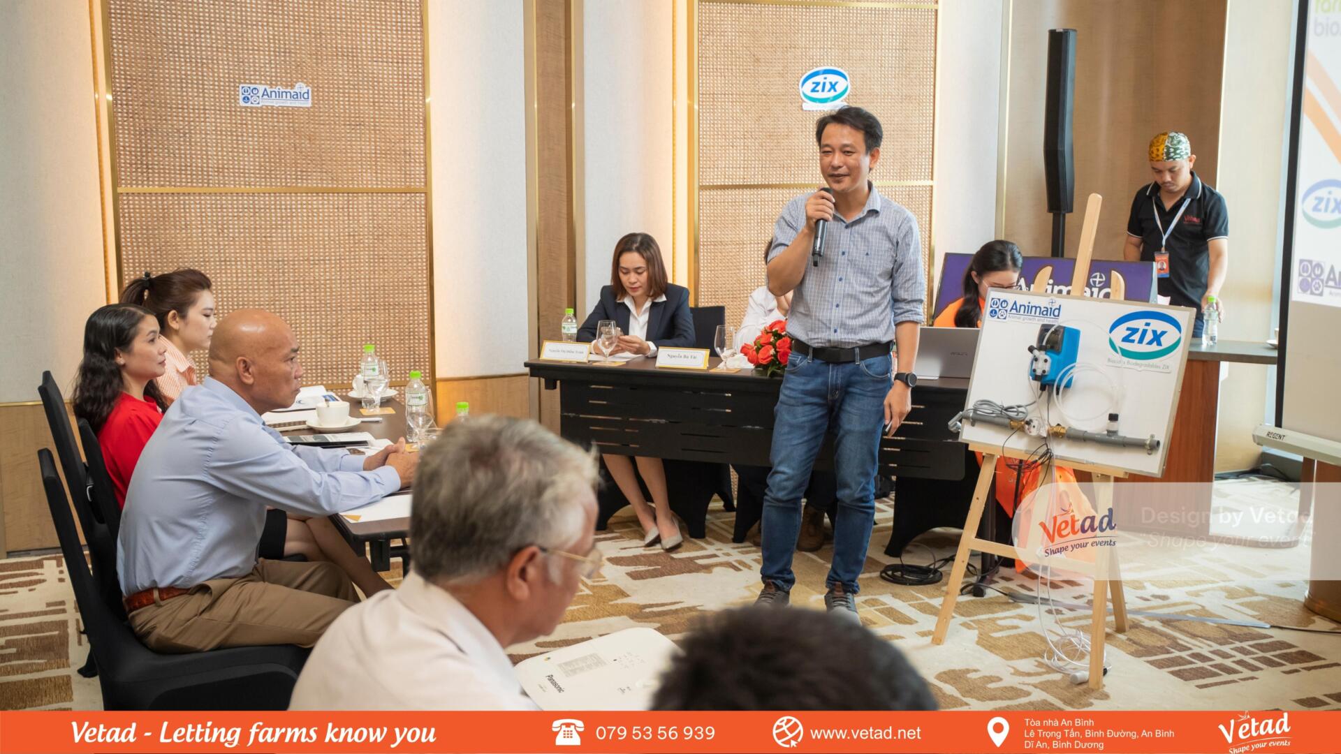 Đại diện công ty Animaid giới thiệu các giải pháp sát trùng của công ty Animaid